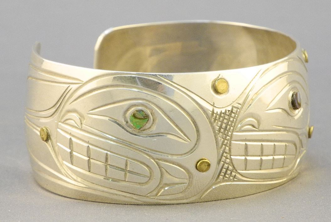 LOT 249 Kwagiulth Abalone & Gold Inset Silver Cuff, Monogrammed PS (Pat Seaweed). Estimate: $200 - $300 Sold For: $340 Auction Date: Tuesday, June 21 2022 at 6:00 PM