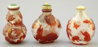 3 Red Overlay Peking Glass Snuff Bottles with Various Loose Caps, 2" - 2 1/4".