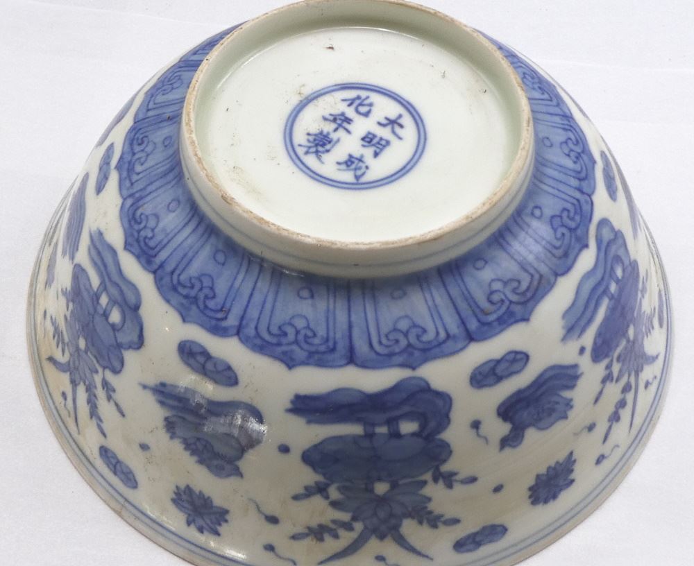 LOT 230 Blue & White "Duck Pond" Bowl, Cheng Hua Mark, 7 1/2" Diameter, 20th C. Estimate: $150 - $200 Sold For: $190 Auction Date: Tuesday, August 16 2022 at 6:00 PM