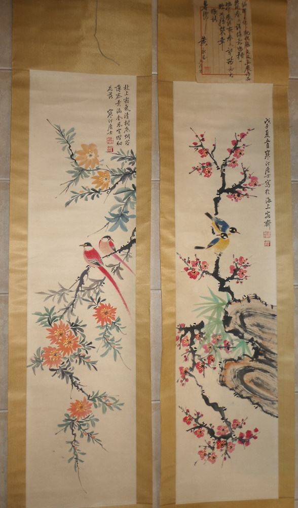 LOT 115 Pair of Watercolour & Ink Scrolls of Bird Gardens, After Chiang Han-t'ing , 73 1/2" x 6 1/2", 20th C Estimate: $150 - $200 Sold For: $60 Auction Date: Tuesday, August 16 2022 at 6:00 PM