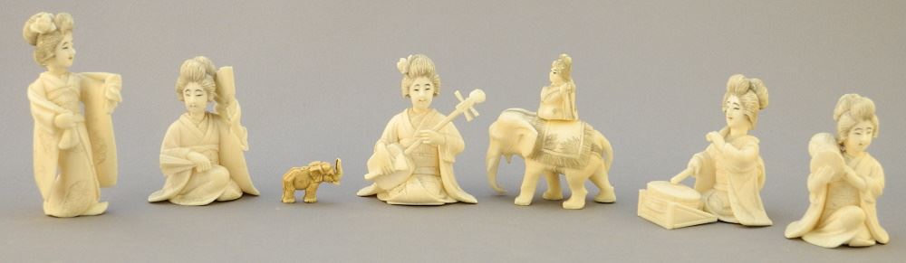 LOT 272 5 Japanese Okimono of Musicians & Elephant Carving, Tallest 2 5/8". Estimate: $150 - $200 Sold For: $100 Auction Date: Tuesday, August 16 2022 at 6:00 PM