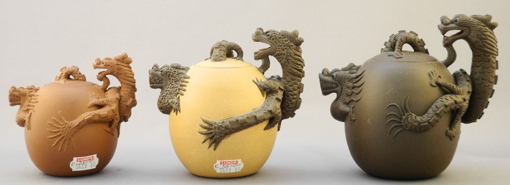 LOT 295 3 Yixing Ware Dragon Handle Teapots, 4 3/8" - 4 3/4" High. Estimate: $150 - $200 Sold For: $80 Auction Date: Tuesday, August 16 2022 at 6:00 PM