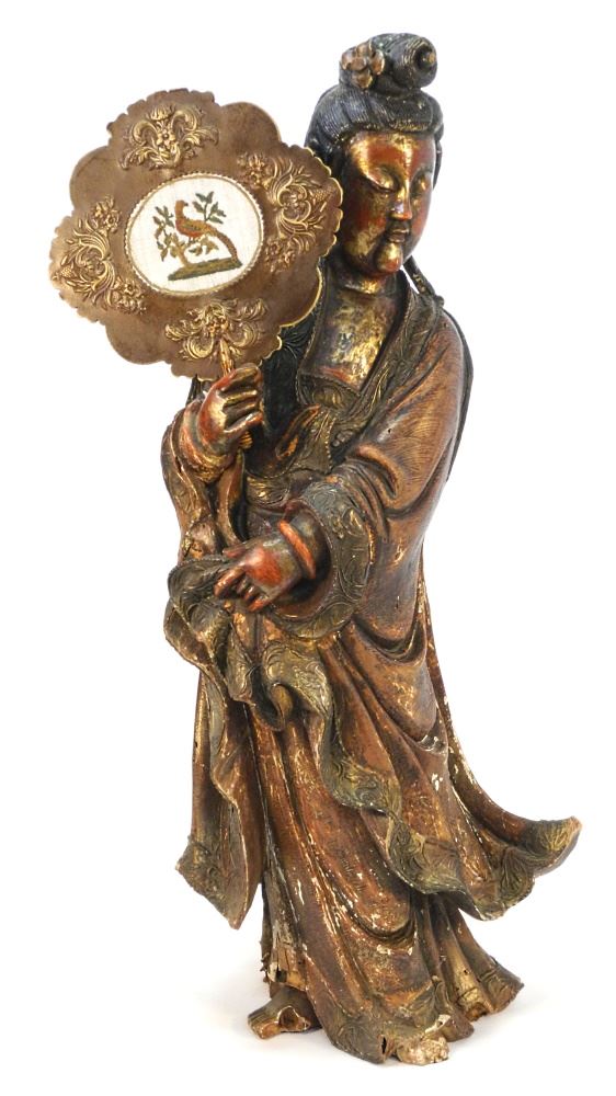 Chinese Gilt & Scarlet Lacquer Figure of Kwan Yin with Fan, 33 3/4" High.