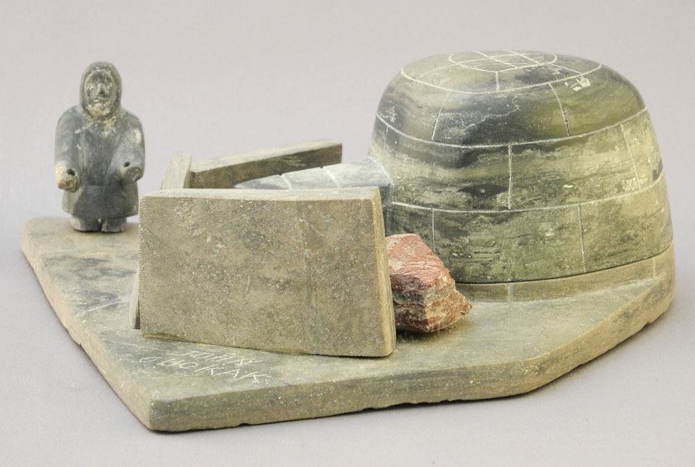 Inuit Igloo Diorama Signed John Ohokak, 2 5/8" x 6 1/2" x 6 3/4".