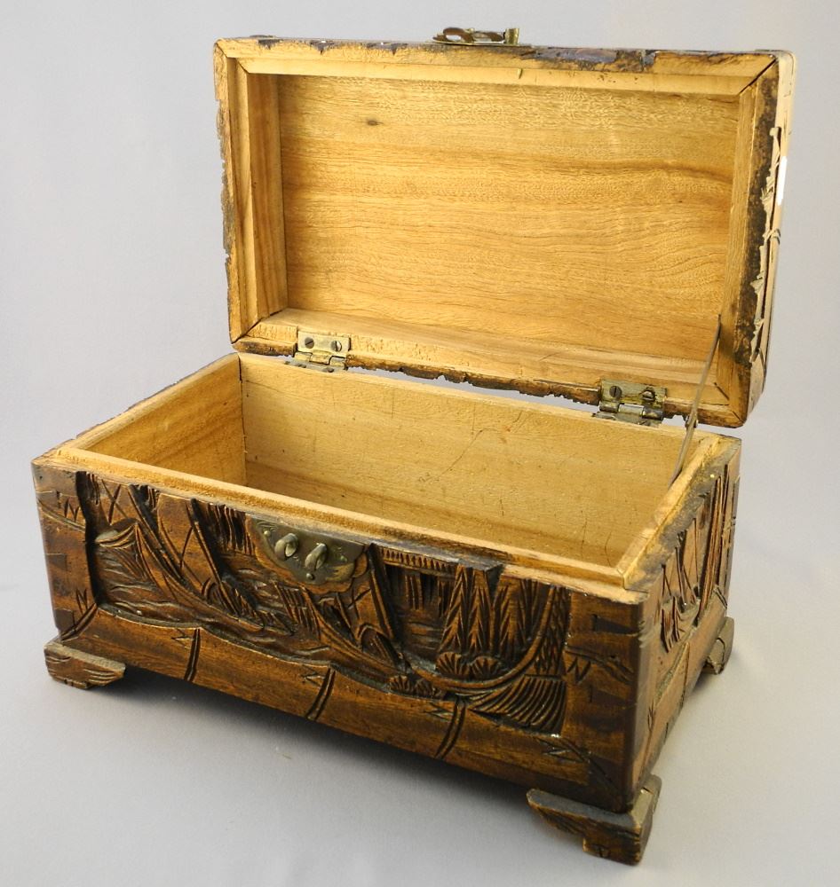 LOT 106 Deep Carved Camphor Wood Box, 6 1/2" x 11 1/2" x 6 1/2". Estimate: $80 - $100 Auction Date: Tuesday, August 16 2022 at 6:00 PM