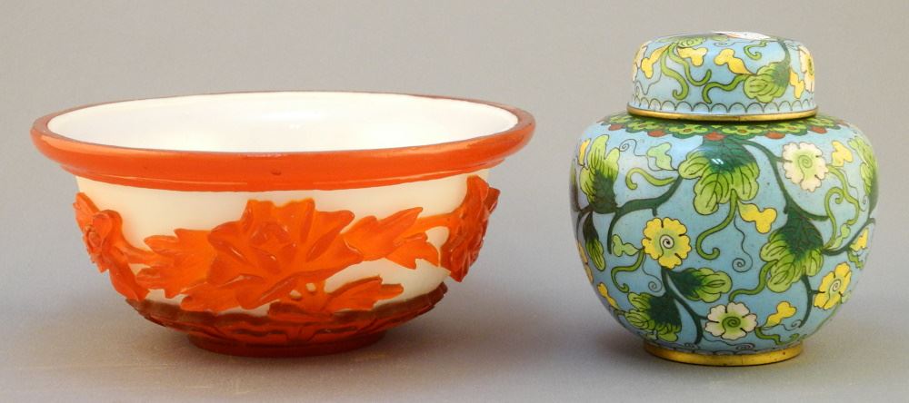 LOT 212 Collection Including: Asian Glass Bowl/ Cloisonne Covered Urn & a Green Stone Brush Washer. Estimate: $60 - $100 Sold For: $10 Auction Date: Tuesday, November 29 2022 at 6:00 PM