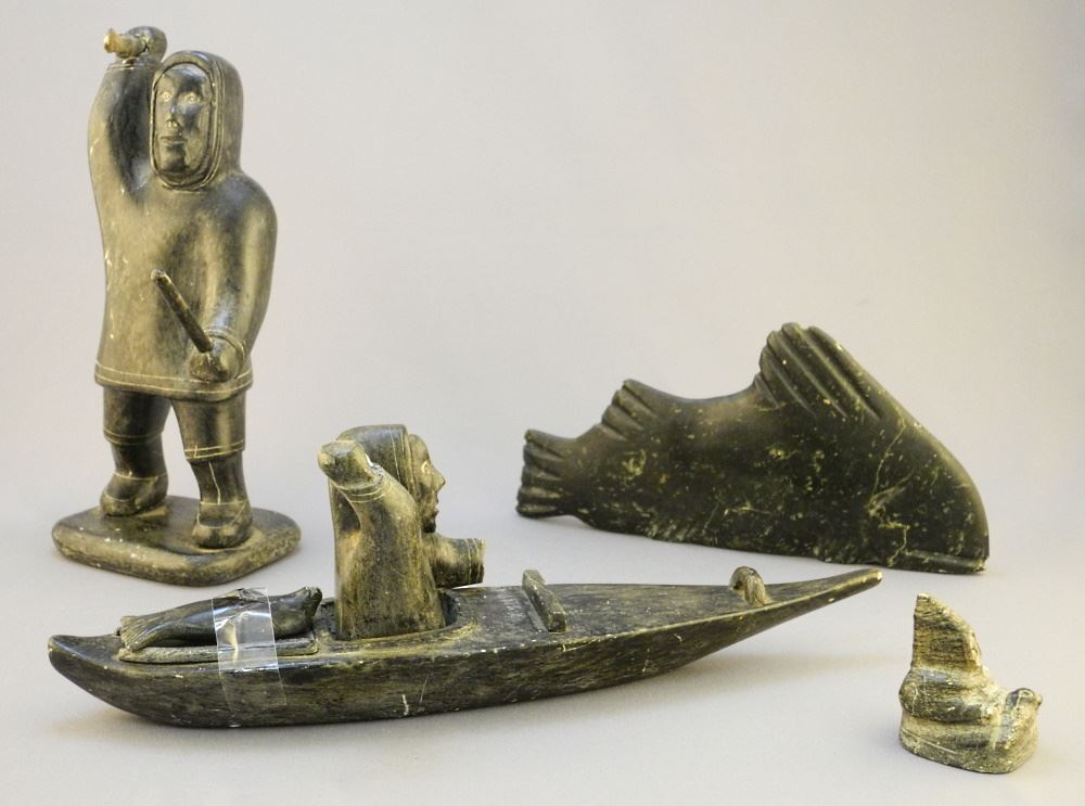 LOT 233 4 Inuit Items: Kayak & Figure (8") Signed Mingeriak, Fish & Miniature Figure Estimate: $100 - $200 Sold For: $100 Auction Date: Tuesday, November 29 2022 at 6:00 PM