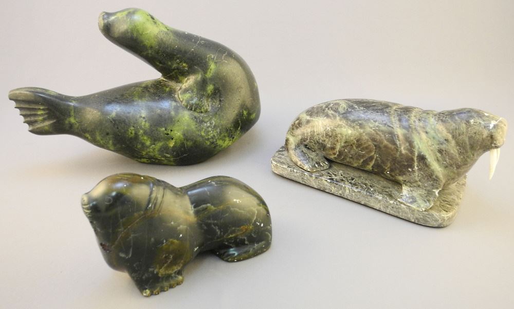 LOT 161 Three Inuit Stone Carvings of Seals & a Walrus, 9 1/2" Length. Estimate: $80 - $120 Auction Date: Tuesday, February 14 2023 at 4:00 PM