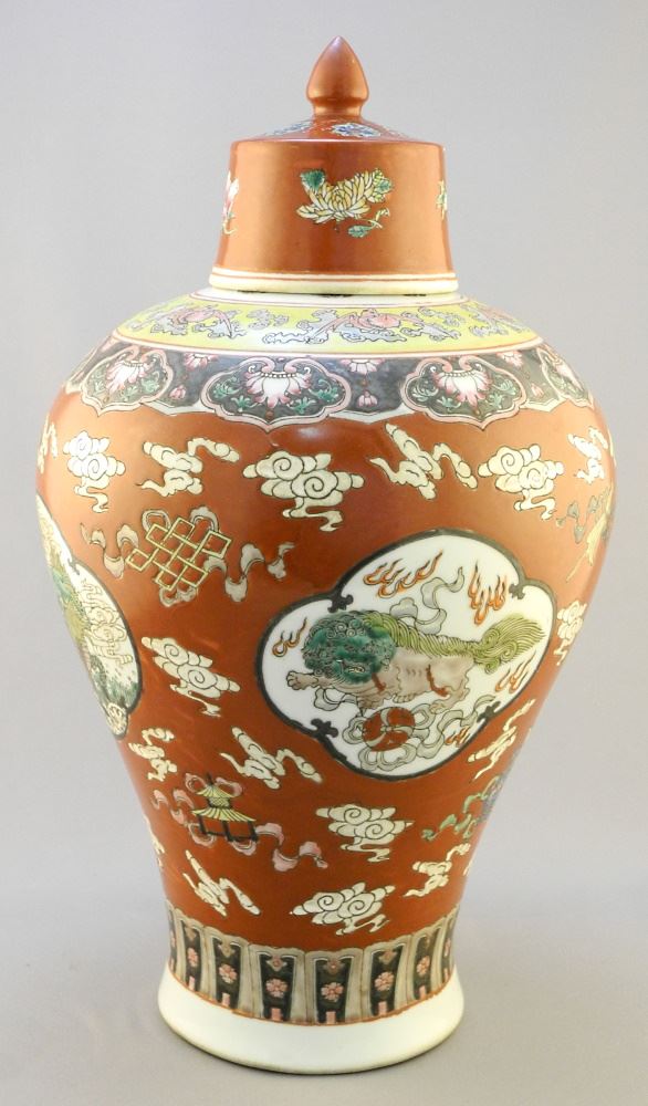 Kang Xi Style Overglaze Iron Red Enamel Covered Vase, 14 1/2"H.