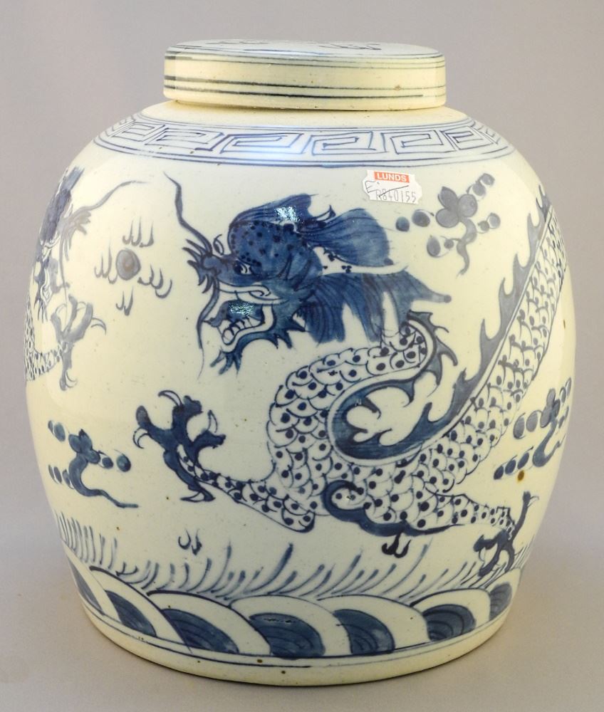 Chinese Blue & White Porcelain Covered Jar, 9"H.