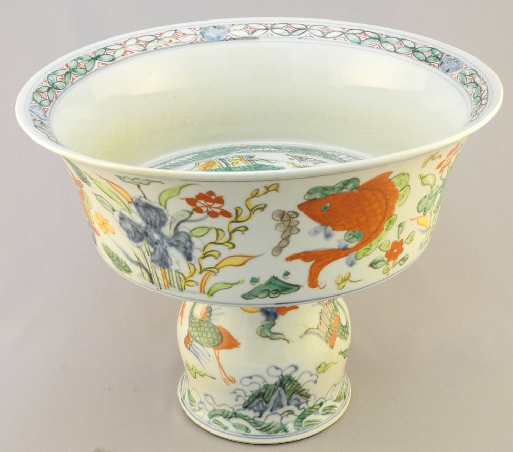 Ming-Style Wucai Pedestal Bowl, 9 1/ 8" x 11 1/4" Diam.
