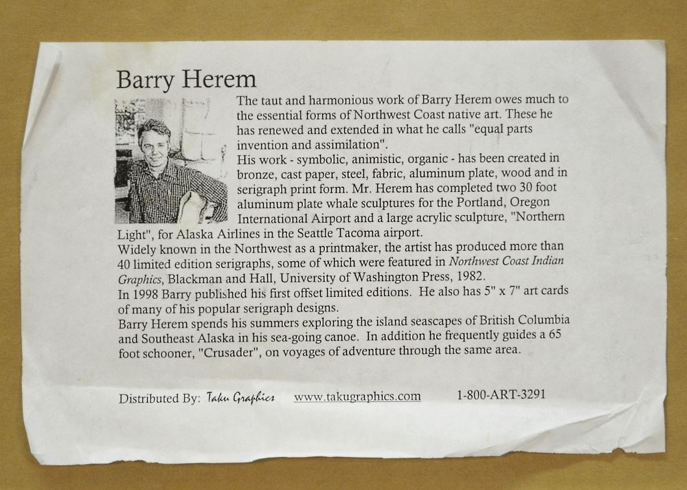 LOT 275 Serigraph Signed B. (Barry) Herem, "Diving Whale", 9 1/2" X 7 1/2". Estimate: $50 - $100 Sold For: $70 Auction Date: Tuesday, February 14 2023 at 4:00 PM