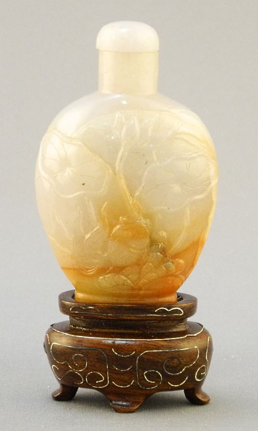 White Jade Snuff Bottle with Russet Inclusions with Stand, 2 5/8" High.