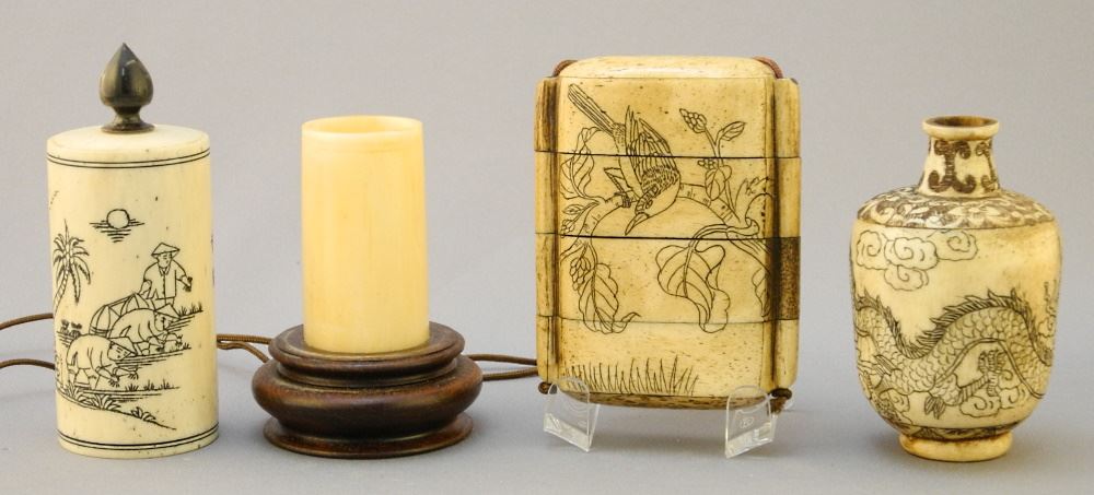 Chinese Carved Bone Inro Snuff Bottle & Covered Container, 4 1/4"H.