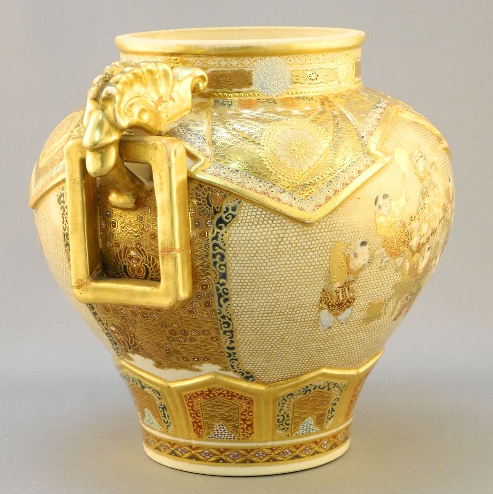 Satsuma Handled Vase (handle restored/no cover), 6 1/4" x 7 3/4" x 6".