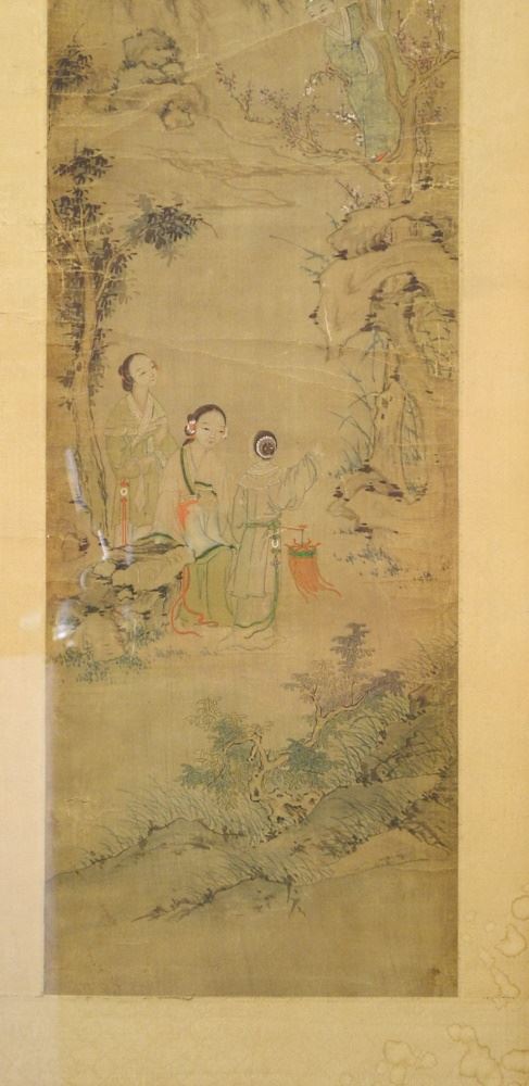 Chinese Ink & Colour on Silk, 37 5/8" x 7 7/8", "Man Observing Women in Tree".