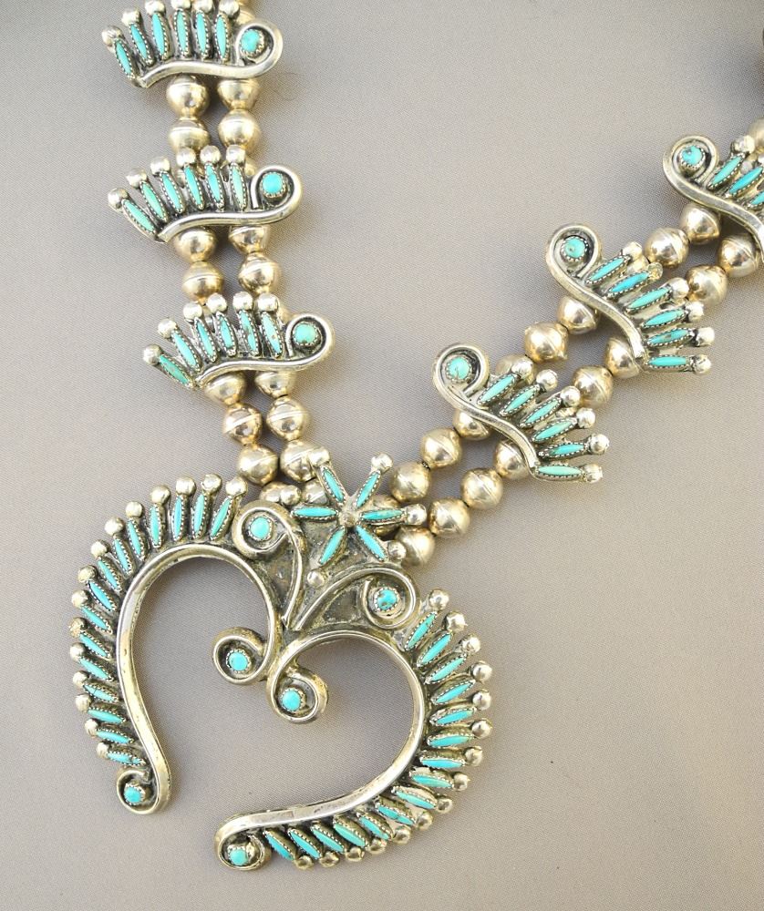 LOT 78 Bisbee Turquoise & Silver Navajo Squash Blossom Necklace, 25 1/4"L. Estimate: $1,000 - $1,500 Auction Date: Tuesday, March 28 2023 at 4:00 PM