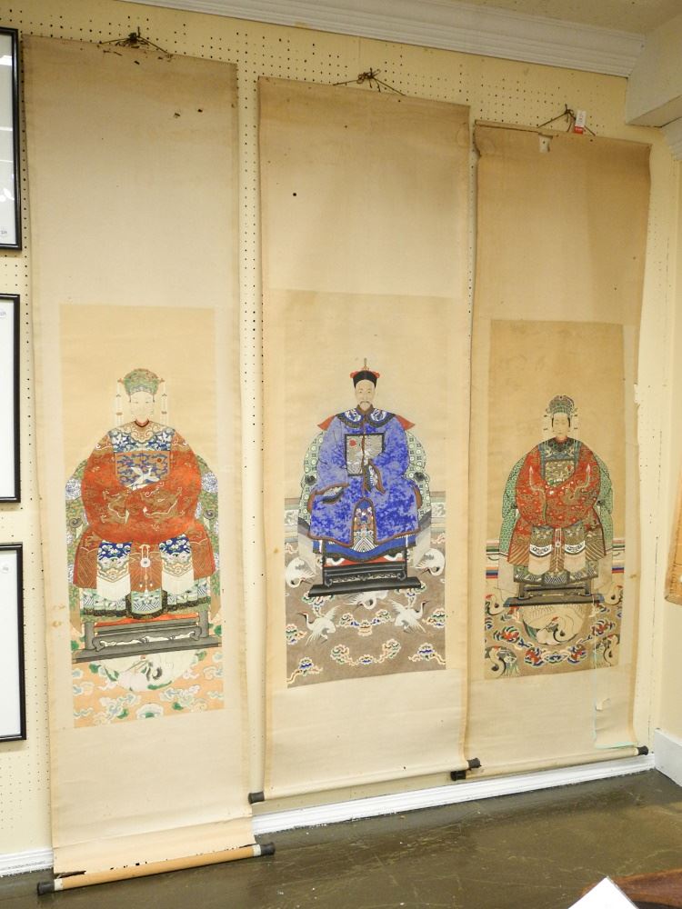 3 Mandarin Subject Ink & Colour Scroll Paintings, 47"- Condition Noted.