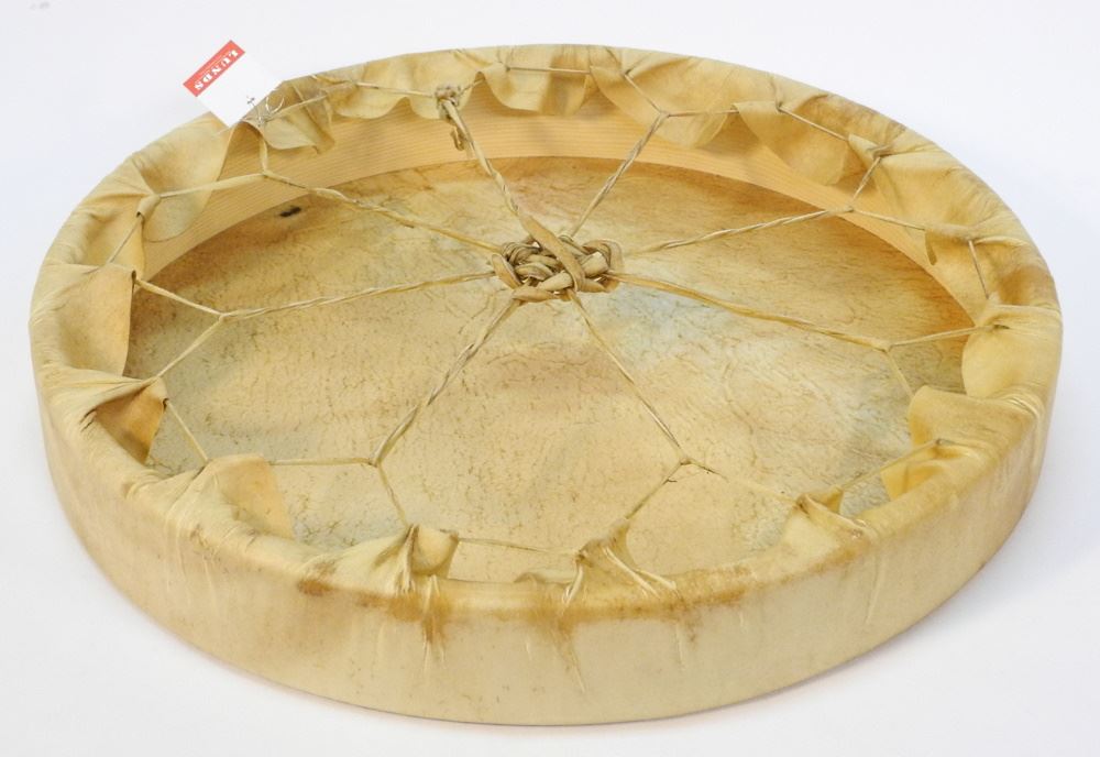 Hide Drum with Hummingbird Design Signed Virgil Sampson, 20"d.