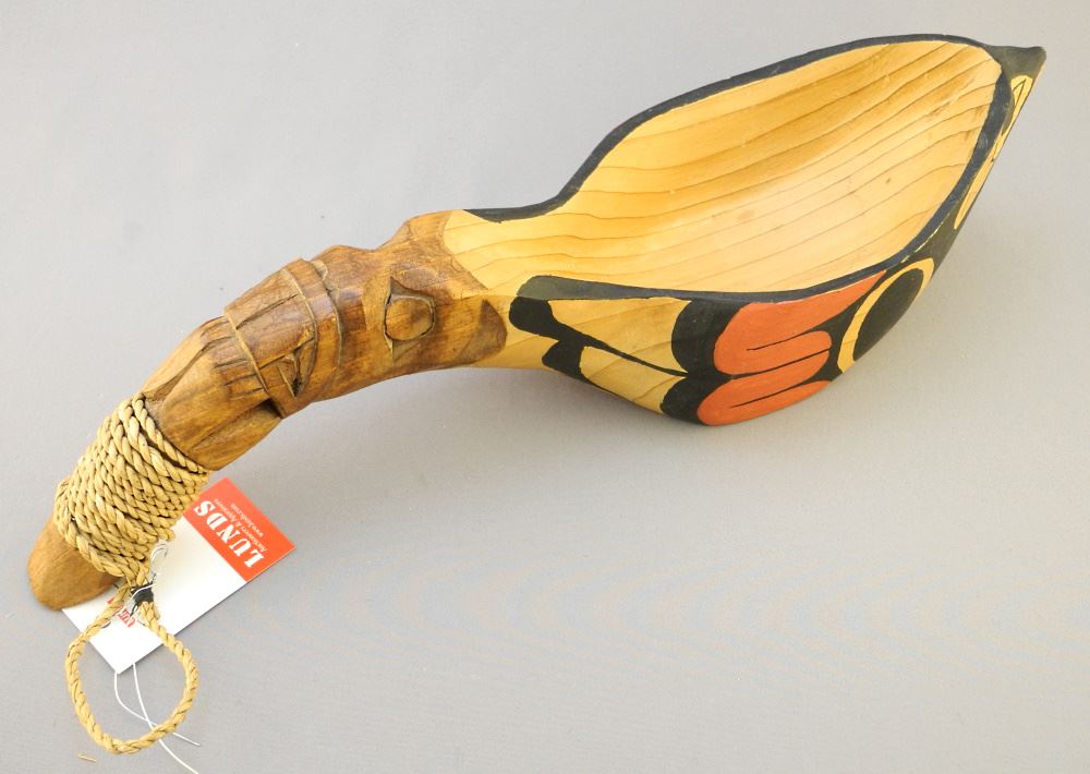 LOT 202 Kwagiulth Feast Ladle Signed Jacob Joe - Duncan BC, 15 3/4" long. Estimate: $120 - $180 Sold For: $140 Auction Date: Tuesday, May 30 2023 at 4:00 PM