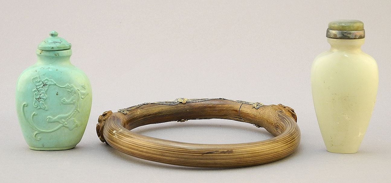 LOT 288 2 Snuff Bottles; Jade (2 3/8") & Turquoise (2 1/8"h) with Bamboo Bangle. Estimate: $100 - $200 Sold For: $700 Auction Date: Tuesday, July 25 2023 at 4:00 PM