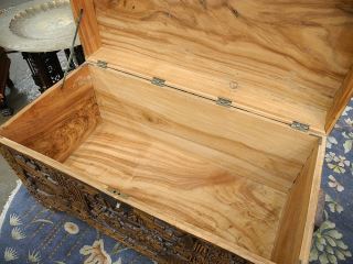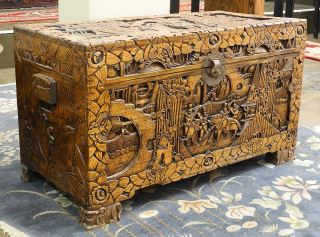 LOT 148 Deep Carved Camphor Wood Chest, 25 3/8" x 46" x 21 3/4". Estimate: $300 - $400 Auction Date: Tuesday, October 03 2023 at 4:00 PM