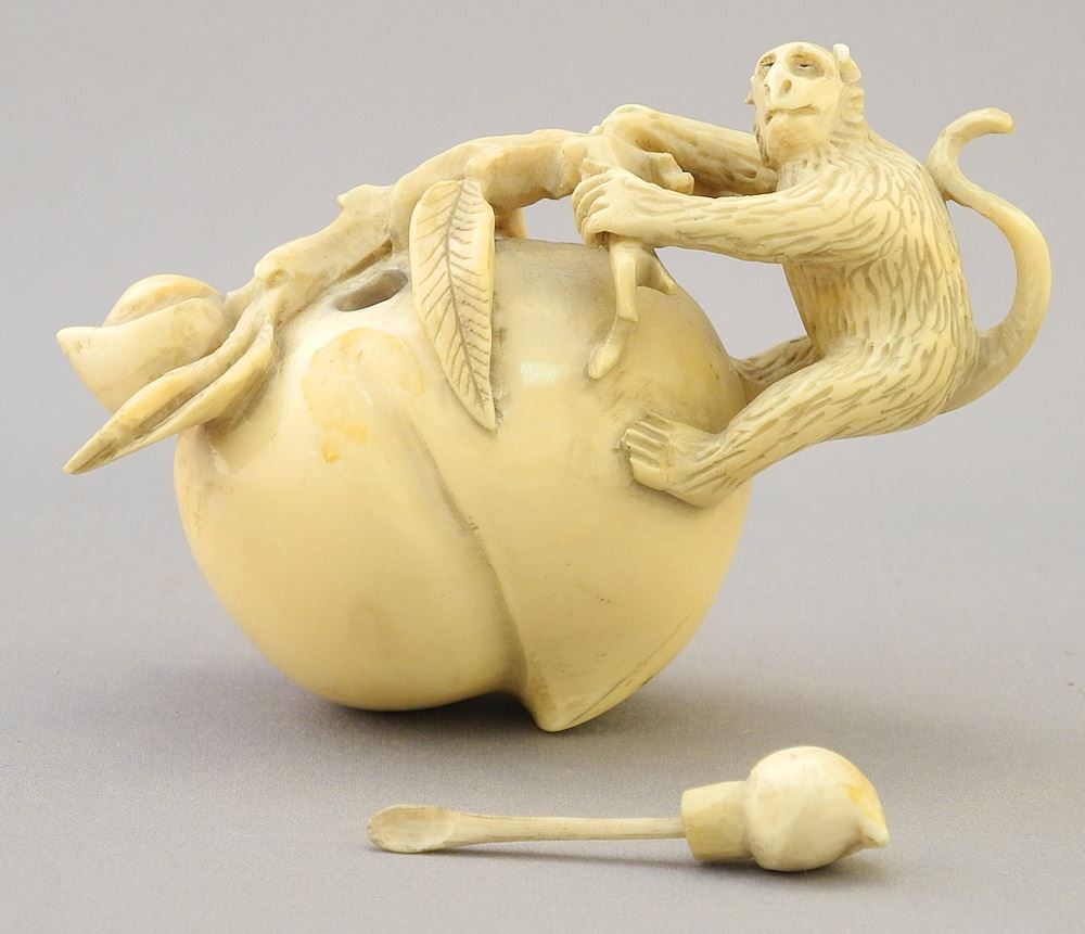 LOT 70 Chinese "Monkey & Peach" Snuff Bottle, 2 1/4 x 3 1/4 x 1 1/2" NO EXPORT. Estimate: $100 - $150 Sold For: $130 Auction Date: Tuesday, October 03 2023 at 4:00 PM