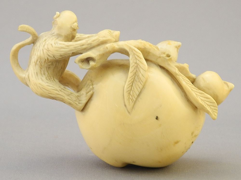 Chinese "Monkey & Peach" Snuff Bottle, 2 1/4 x 3 1/4 x 1 1/2" NO EXPORT.