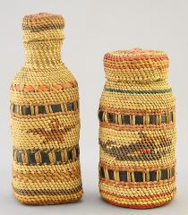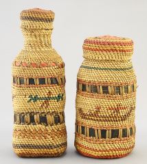 2 Nu-Chah-Nulth Basketry Covered Bottles, 5 1/4" & 4 1/4", "Whaling".
