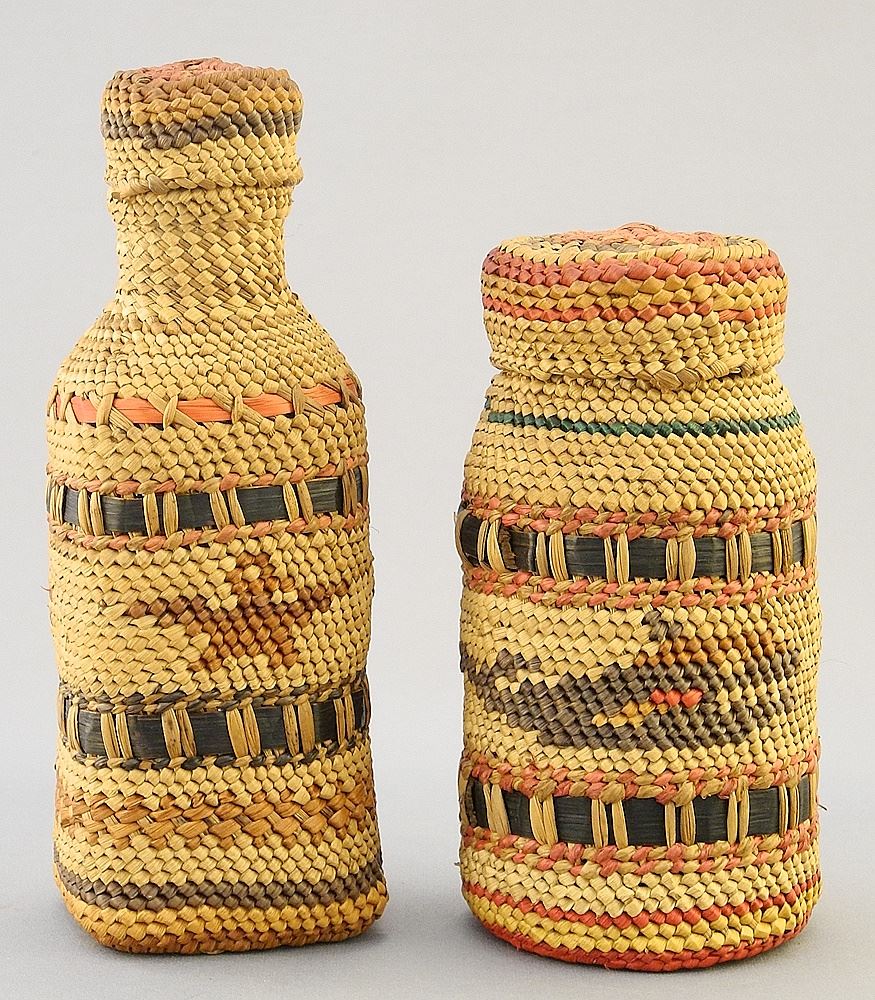 LOT 62 2 Nu-Chah-Nulth Basketry Covered Bottles, 5 1/4" & 4 1/4", "Whaling". Estimate: $100 - $150 Sold For: $140 Auction Date: Tuesday, October 03 2023 at 4:00 PM