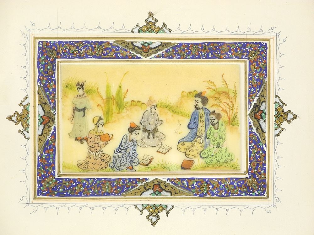 Persian Miniature Depicting Scholars 2 1/2 x 3 7/8".