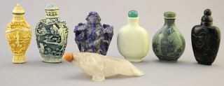 LOT 21 7 Various Chinese Snuff Bottles: 2 Molded/ 2 Porcelain/ 3 Stone, 2 1/4" - 3 1/4" High Estimate: $100 - $200 Sold For: $150 Auction Date: Tuesday, October 03 2023 at 4:00 PM