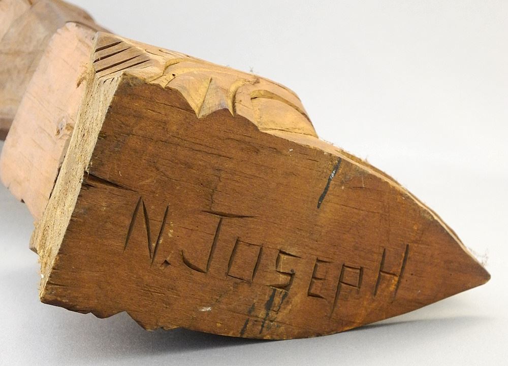 LOT 249 Nuu-Chah-Nulth Model Totem Pole signed N.Joseph, 14 1/2"H. Estimate: $80 - $100 Sold For: $90 Auction Date: Tuesday, October 03 2023 at 4:00 PM