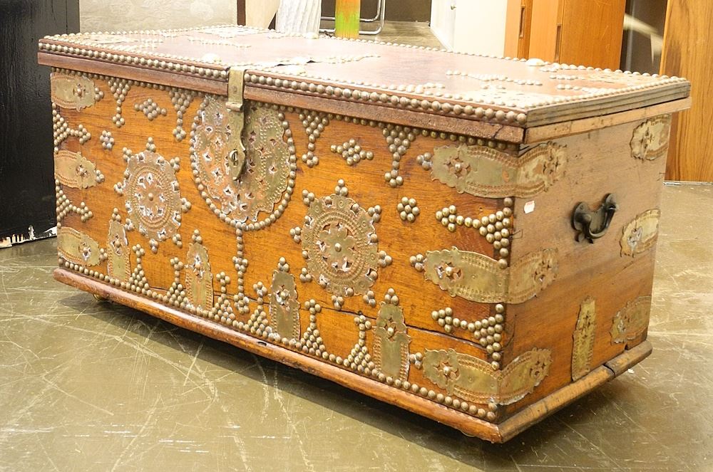 LOT 87 Metal Mounted Hardwood Zanzibar Dowry Chest, 35 3/4"W. Estimate: $150 - $300 Sold For: $650 Auction Date: Tuesday, October 03 2023 at 4:00 PM