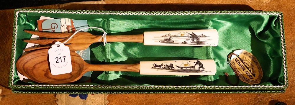 LOT 217 Alaskan Scrimshaw Ivory Salad Servers with Gold Nuggets signed Nuguruk / Soapstone Fish, Estimate: $200 - $300 Auction Date: Tuesday, October 03 2023 at 4:00 PM
