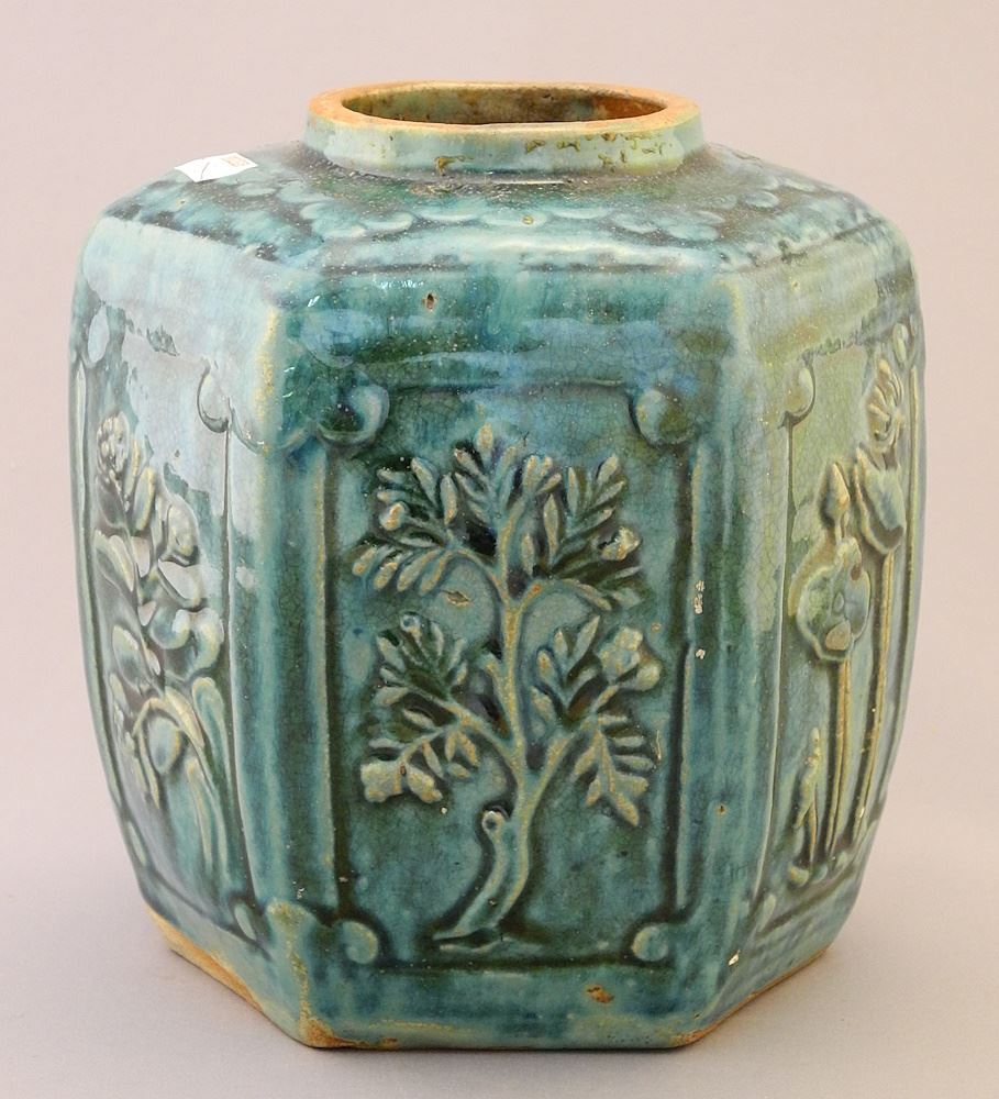 LOT 17 Chinese Blue/Green Glazed Hexagonal Molded Porcelain Jar, 6 3/8"H. Estimate: $60 - $100 Auction Date: Tuesday, October 03 2023 at 4:00 PM