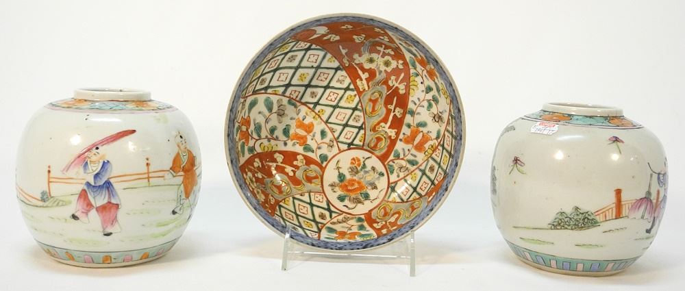 LOT 213 3 Asian Ceramics: 2 Jars & Japanese Imari Bowl, 2 3/4" - 4 7/8"H. Estimate: $60 - $100 Auction Date: Tuesday, January 30 2024 at 4:00 PM