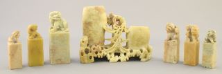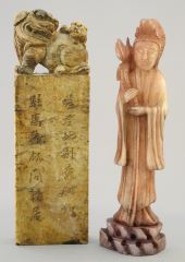LOT 329 Collection of Chinese Softstone Carvings: Seal / Figure / Bookends, 7"H. Estimate: $60 - $100 Sold For: $110 Auction Date: Tuesday, January 30 2024 at 4:00 PM