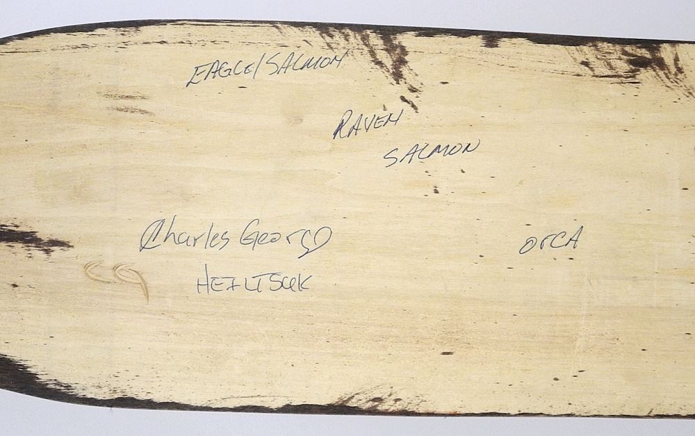 Heiltsuk Paddle signed Charles George, 49"L, "Eagle / Salmon / Raven / Orca".