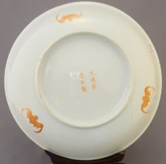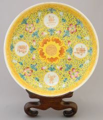 Pair of Chinese Famille Rose Yellow Ground Dishes, Qianlong Mark with Stands (restored edge note