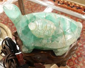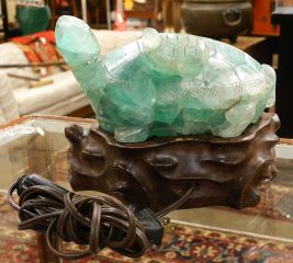 Asian Green Quartz Turtle Lamp with Wood Stand, 6 3/8 x 8 x 5".