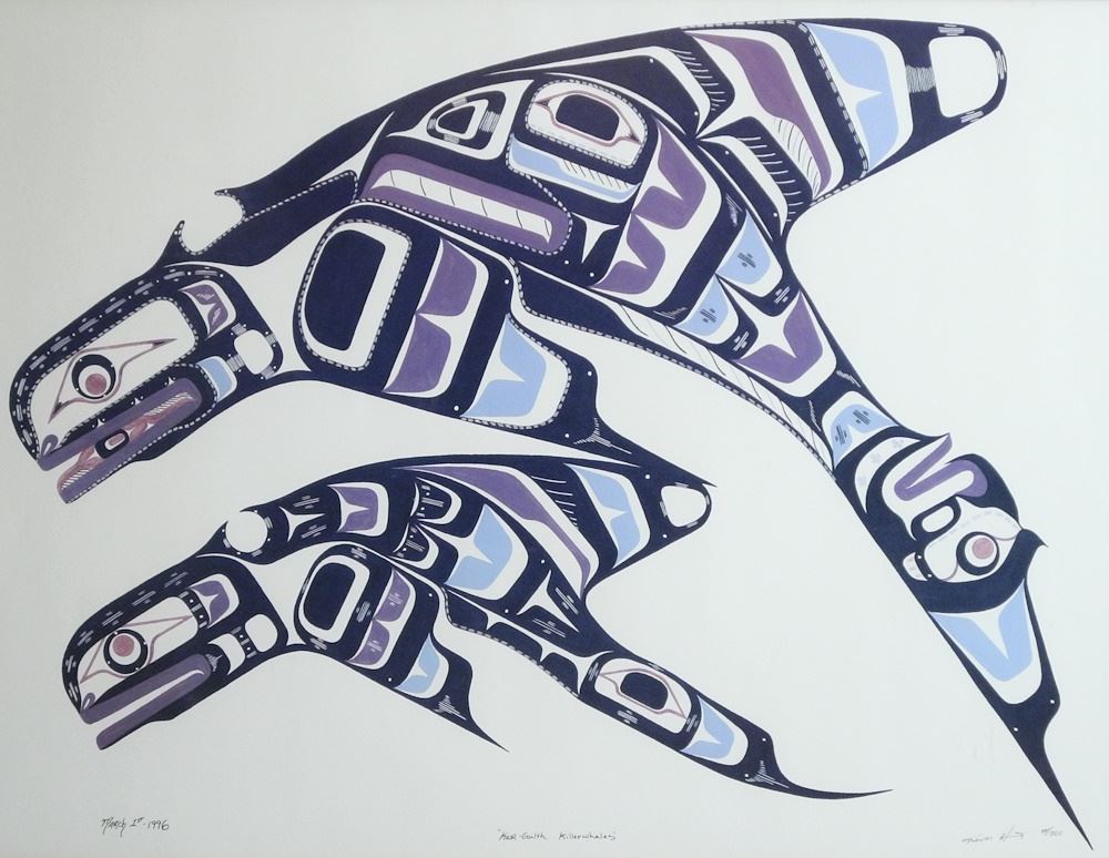Coloured Print signed Trevor Hunt, March 1, 1996, 19" x 24 7/8", "Kwaguilth Killer Whales"