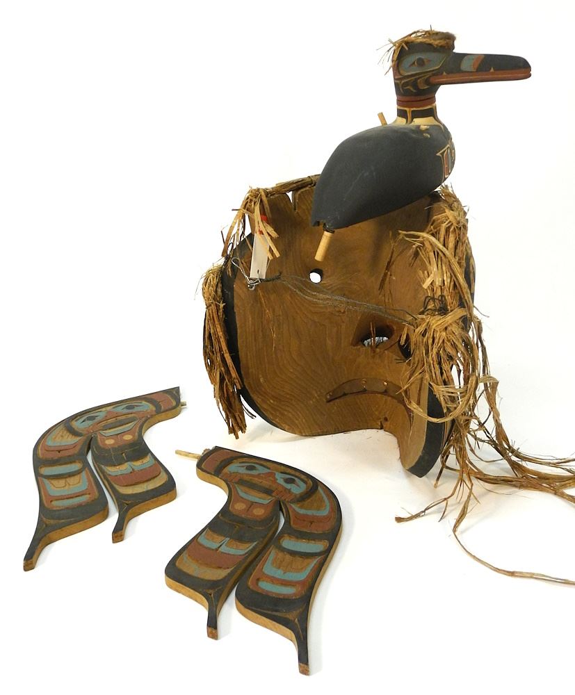 Kwagiulth Articulated Mask signed Kevin Cranmer, 21"H, "Komokwa with Loon,restoration required.