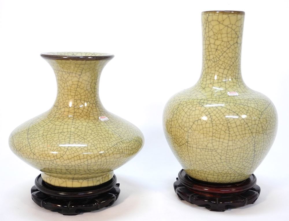 2 Chinese Crackle Glaze Porcelain Vases with Stands, 12 3/4" & 9 3/4"H