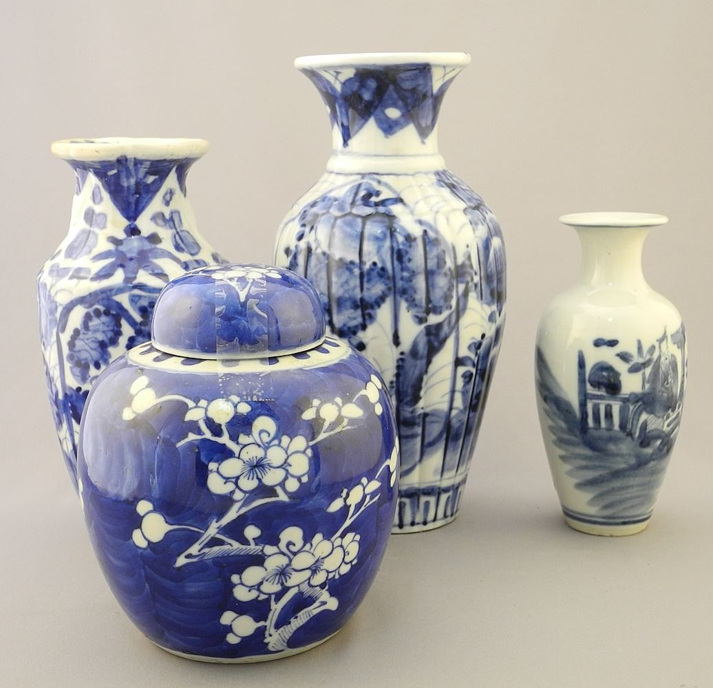 LOT 218 4 Chinese Blue & White Vases & Jar, 5 7/8" - 9 1/4"H. Estimate: $80 - $100 Sold For: $40 Auction Date: Tuesday, March 19 2024 at 4:00 PM