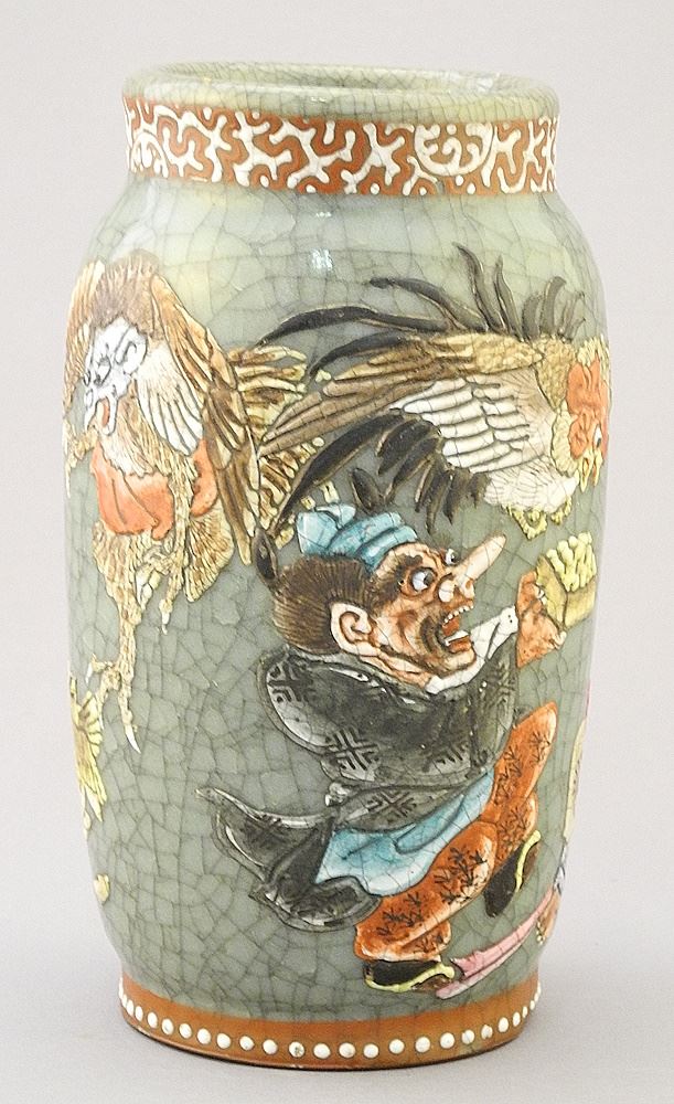 Japanese Enameled Celadon Porcelain "Demon Birds" Vase, 6 7/8"H.