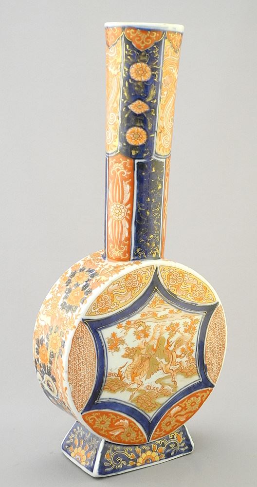 LOT 27 Japanese Imari Porcelain Vase, Flat Sided with Tall Neck, 13 1/2"H (small rim chip noted). Estimate: $200 - $300 Auction Date: Tuesday, March 19 2024 at 4:00 PM