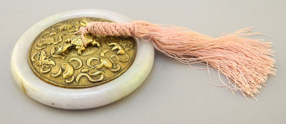 Chinese Bronze & Jade Bangle Hand Mirror, 3 1/2" diameter.