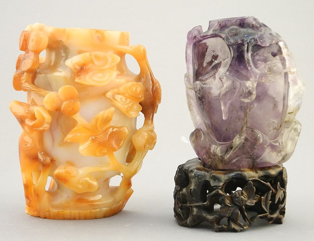 LOT 44 2 Vase Carvings with Stands (no lids): Amethyst (3 1/2"H) and Agate (4 5/8"H). Estimate: $50 - $150 Sold For: $40 Auction Date: Tuesday, March 19 2024 at 4:00 PM
