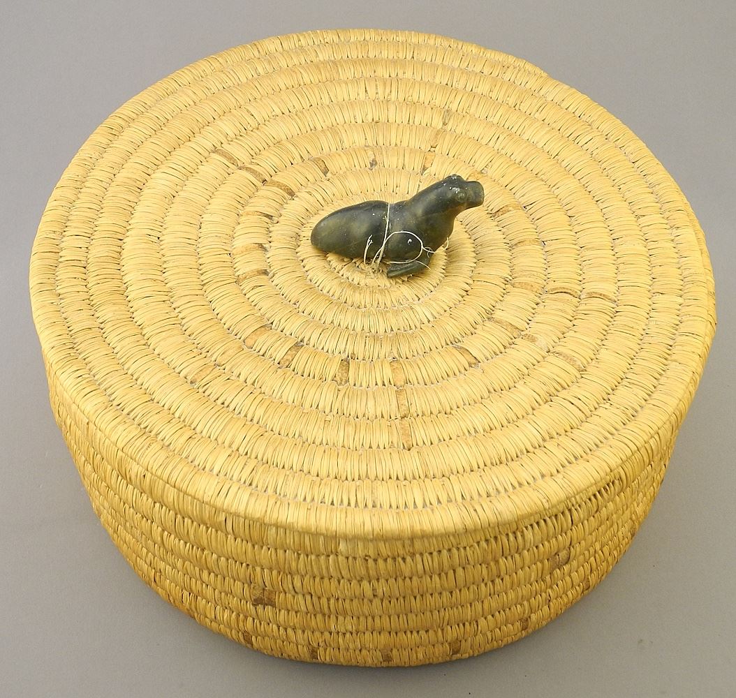 LOT 62 Inuit Grass Basket with Stone Seal Finial, 6" x 10 3/4" Diameter. Estimate: $80 - $100 Sold For: $150 Auction Date: Tuesday, March 19 2024 at 4:00 PM